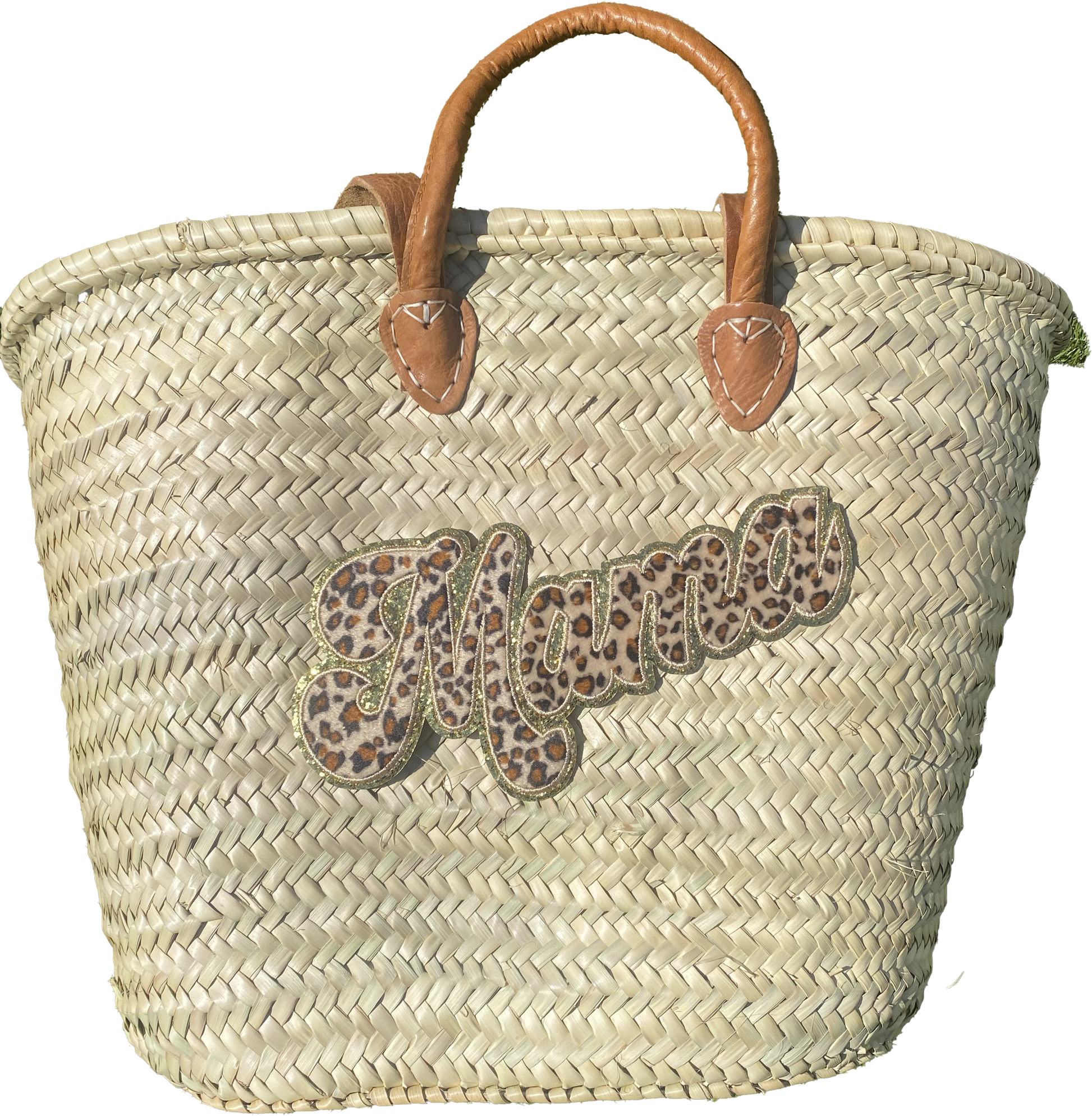 Cabas en palmier naturel avec anses en cuir, avec motif "Mama" style léopard marron.